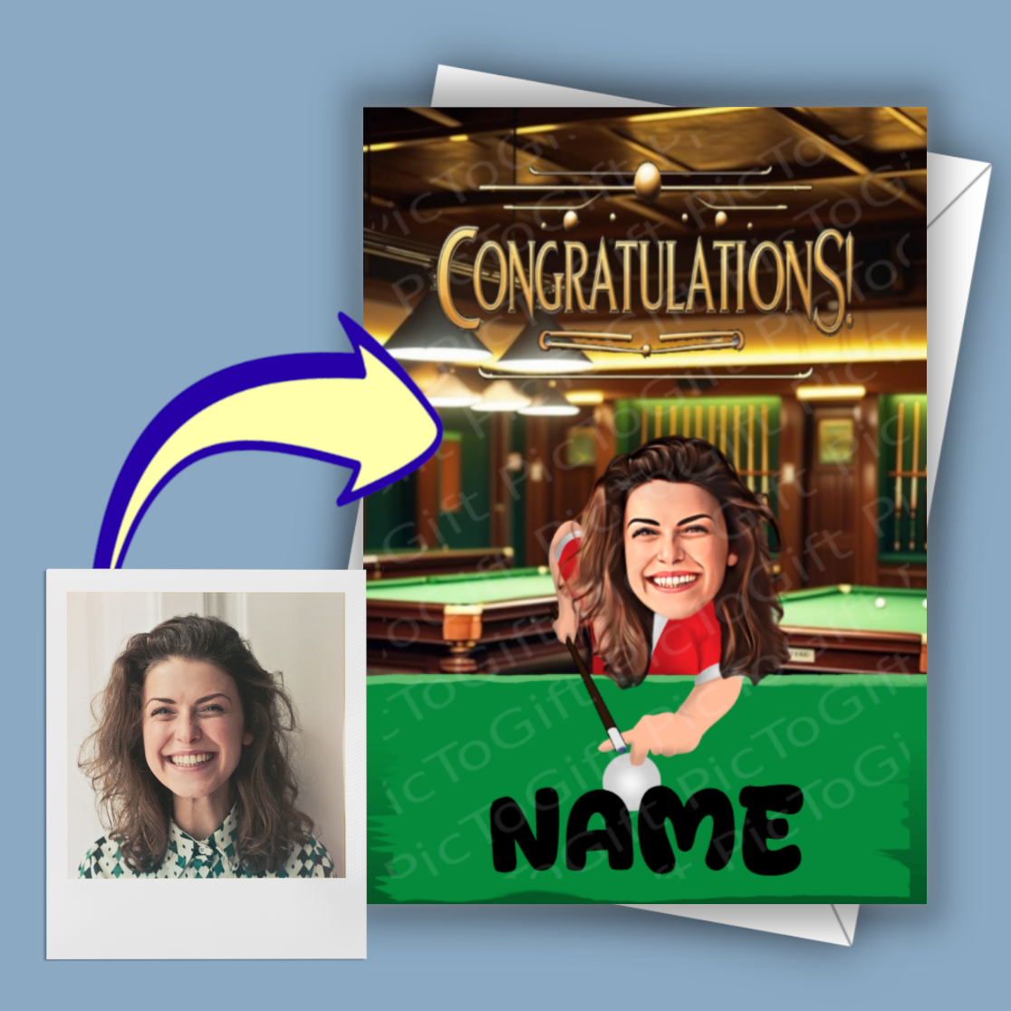 Rack up the laughs with this hilarious Pool / Snooker-themed greeting card! Perfect for any snooker fan, this custom card features their face on a snooker player's body mid-shot — with all the drama of missing the final black. Ideal for birthdays, Father's Day, or just for a good chuckle, this card adds a personal (and funny) touch for any cue-sport lover.